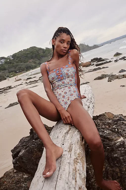 Features: Soft printed fabrication. square neckline. fixed shoulder straps. buttons at center front. shelf bra for added supportive. removeable cups. moderate cut legs