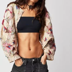 Just as versatile as it is vintage-inspired. this timeless top is featured in a quilted design and boxy. cropped fit with hook-front closure and distressed detailing throughout for a true lived-in look.