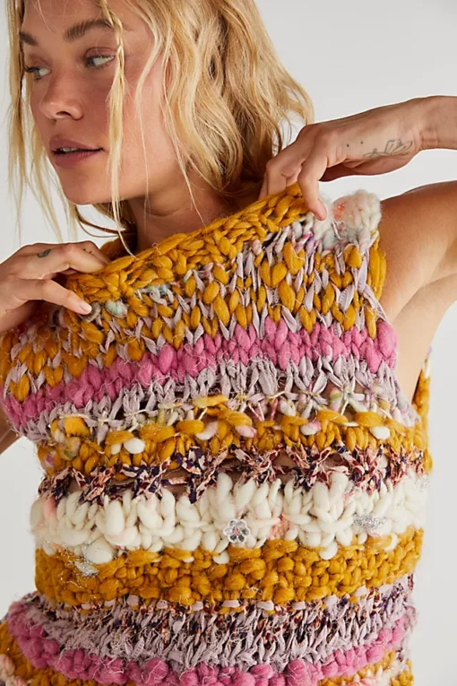 Turn heads in this forever unique sweater vest featured in a chunky knit design with contrasting yarns and colors for a true hand-made touch.