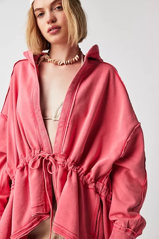 Features: Dropped shoulders. staple hood. exposed seaming. tie-front closure